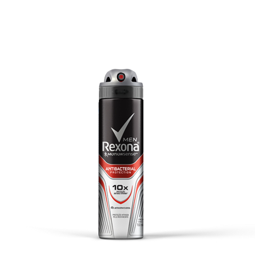 O Desodorante Antitranspirante Aerosol Rexona Men Antibacterial Protection protege 10 vezes mais e elimina 99,9% das bactérias que causam o mau odor.
